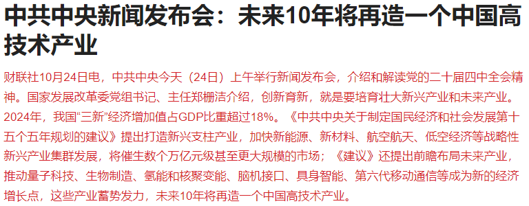 中共中央今天(24日)上午举行新闻发布会,介绍和解读党的二十届四中全会精神。《建议》还提出前瞻布局未来产业,推动量子科技、生物制造、氢能和核聚变能、脑机接口、具身智能、第六代移动通信等成为新的经济增长点,这些产业蓄势发力,未来10年将再造一个中国高技术产业。