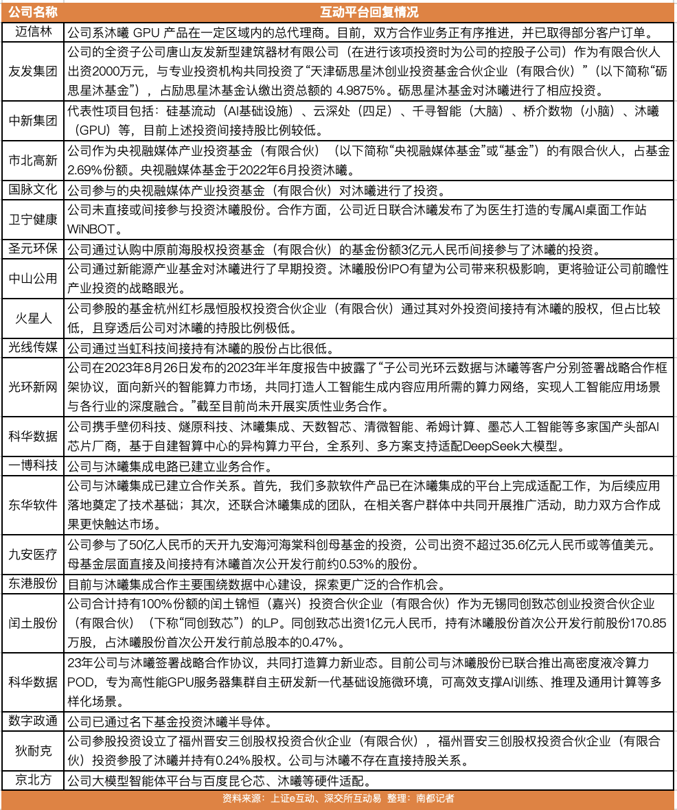 沐曦上会前夕,约20家A股公司在投资互动平台披露对沐曦的参股和合作情况。其中,以环保水务为核心业务的中山公用(000685.SZ)高调回复称,公司通过新能源基金对沐曦进行了早期投资,“沐曦IPO有望为公司带来积极影响,更将验证公司前瞻性产业投资的战略眼光”。