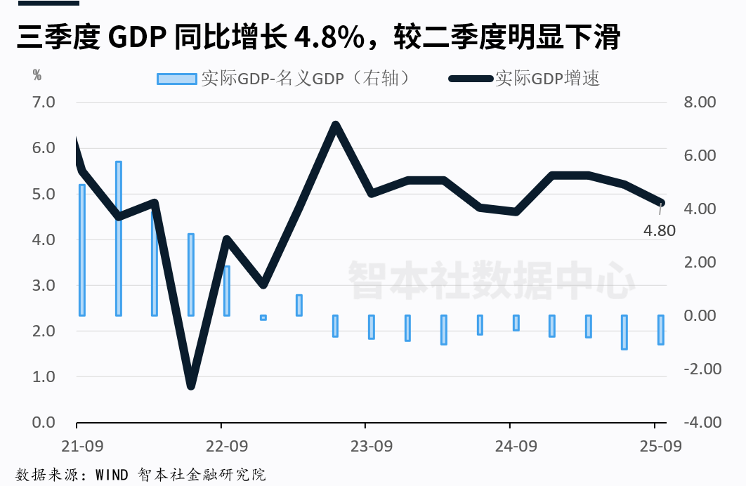2025 年第三季度 GDP 同比增长 4.8%,较第二季度的 5.2% 明显下滑,且低于一季度的 5.4%,整体呈逐季放缓趋势。回溯来看,2024 年四季度依靠财政与货币政策发力,GDP 增速重回 5% 以上并延续至 2025 年二季度,但进入三季度后,经济增长动力显著减弱。