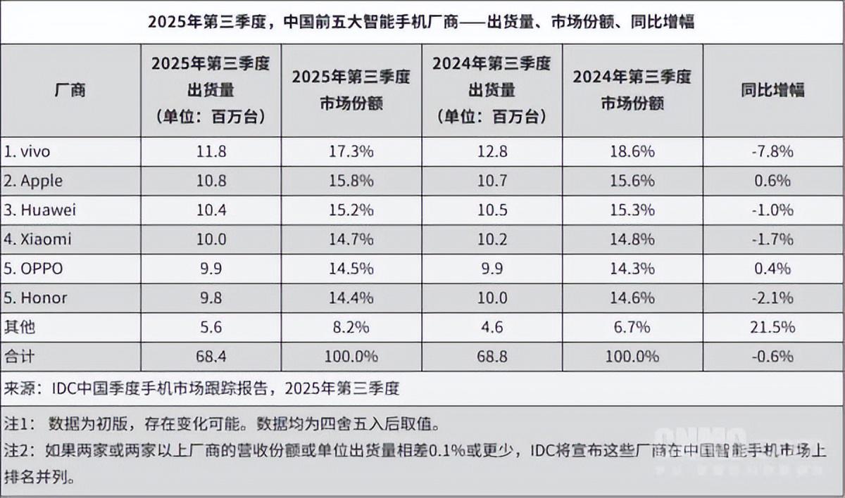 即便不谈高端,小米在全球市场手机出货表现尚可,在国内市场则还有距离,IDC数据显示,小米手机出货量从第一季度的第一名下滑至第三季度的第四名。