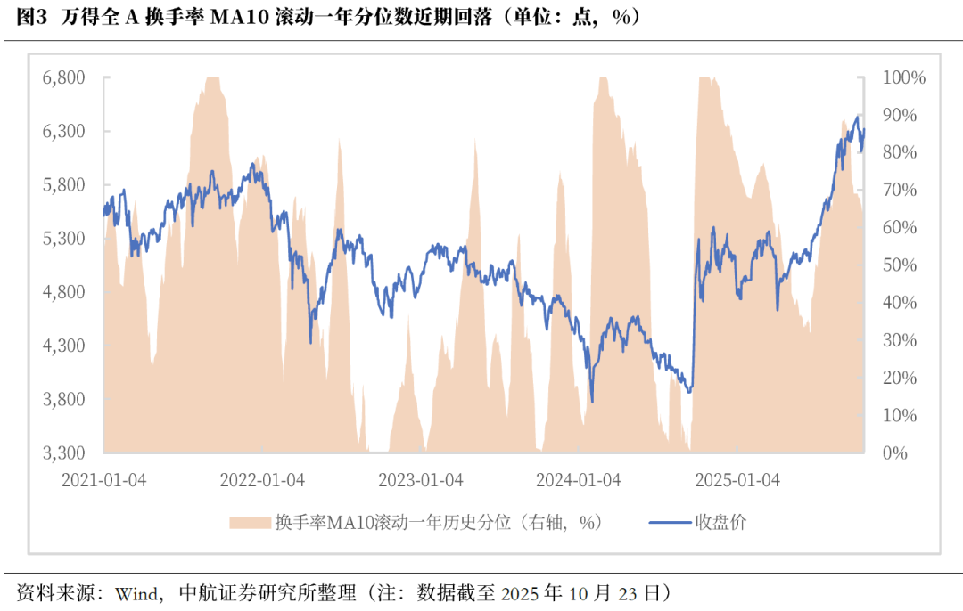 A股方面,中期看,万得全A风险溢价触及三年均值后有所回升,投资者对风险的定价仍较为理性。短期看,市场交易活跃度降温,9月以来万得全A换手率10日移动平均滚动一年分位数由近90%的高位回落至60%以下。结构上,此前热门行业调整后重新迎来配置机会。