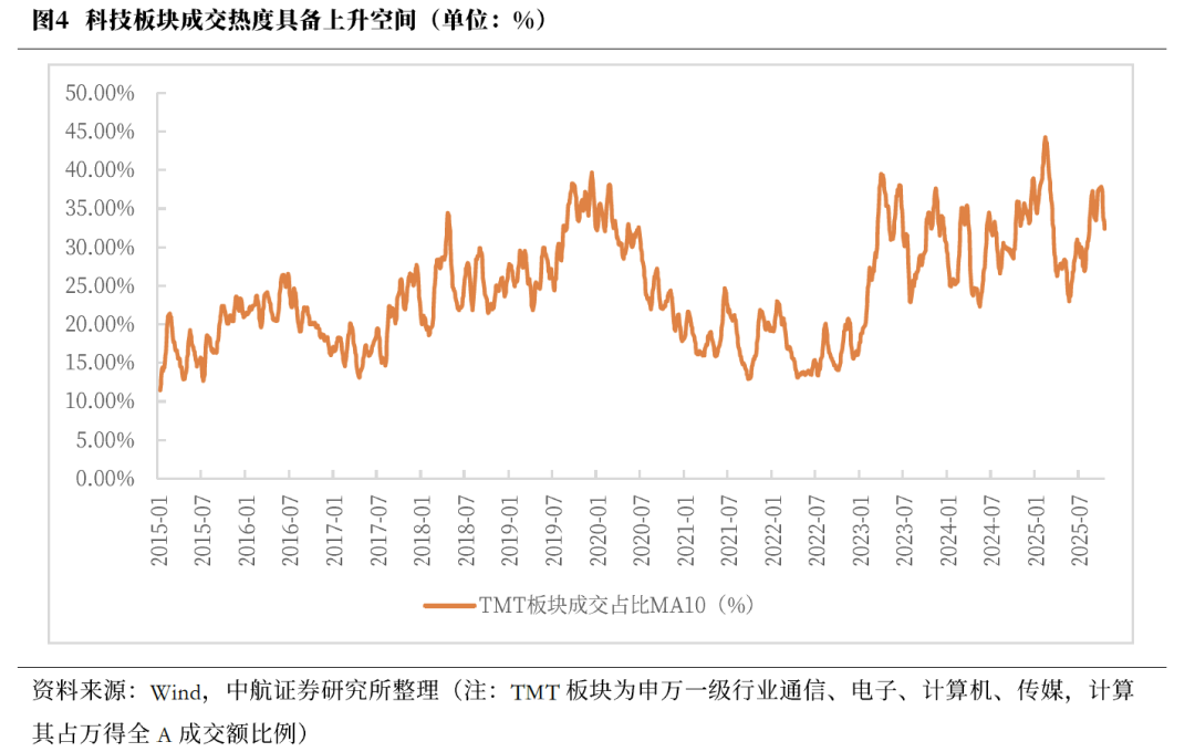 结构上,当前科技板块成交热度有所降温,对比此前高点具备上升空间,等待新质生产力政策推进和业绩确认。中期看,科技叙事有望进一步发酵。当前TMT板块占万得全A成交额比例超过30%,2025年初DeepSeek领衔的科技行情一度将TMT板块成交额占比推升至超过40%,另外,自2015年以来,当前以成交额占比度量的科技板块热度也并未超过2023年4月、2023年6月和2019年12月,显示科技板块仍具备热度提升的空间。短期来看,科创50估值已经提升至创设以来的较高位置,叙事已得到市场认可,当前三季报窗口期,等待业绩进一步确认。中期来看,在十五五规划建议提出“引领发展新质生产力”,更加确认科技是未来五年首要任务方向,政策预期有望升温,科技成长作为弹性较高的版块,可等待叙事进一步发酵。