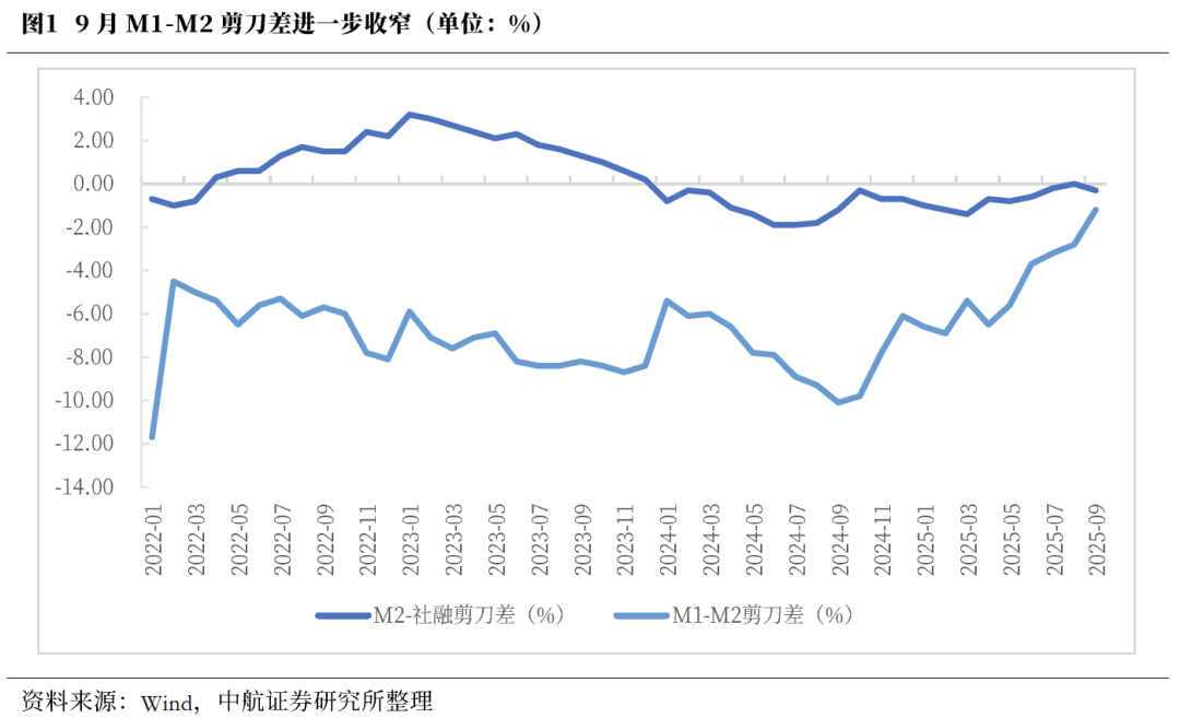 国内方面,9月金融数据显示,经济内生活力持续增强,增长动能稳步修复。M1-M2剪刀差连续第五个月收窄,续创2022年以来新高,显示实体经济和市场主体经营活动活跃度在逐渐提升,资金活化程度显著提升。与此同时,M2-社融剪刀差9月回落至-0.3%,重回负区间,显示堆积在金融体系的剩余流动性回落,或因宽货币效果逐步显现,实体需求边际回暖。