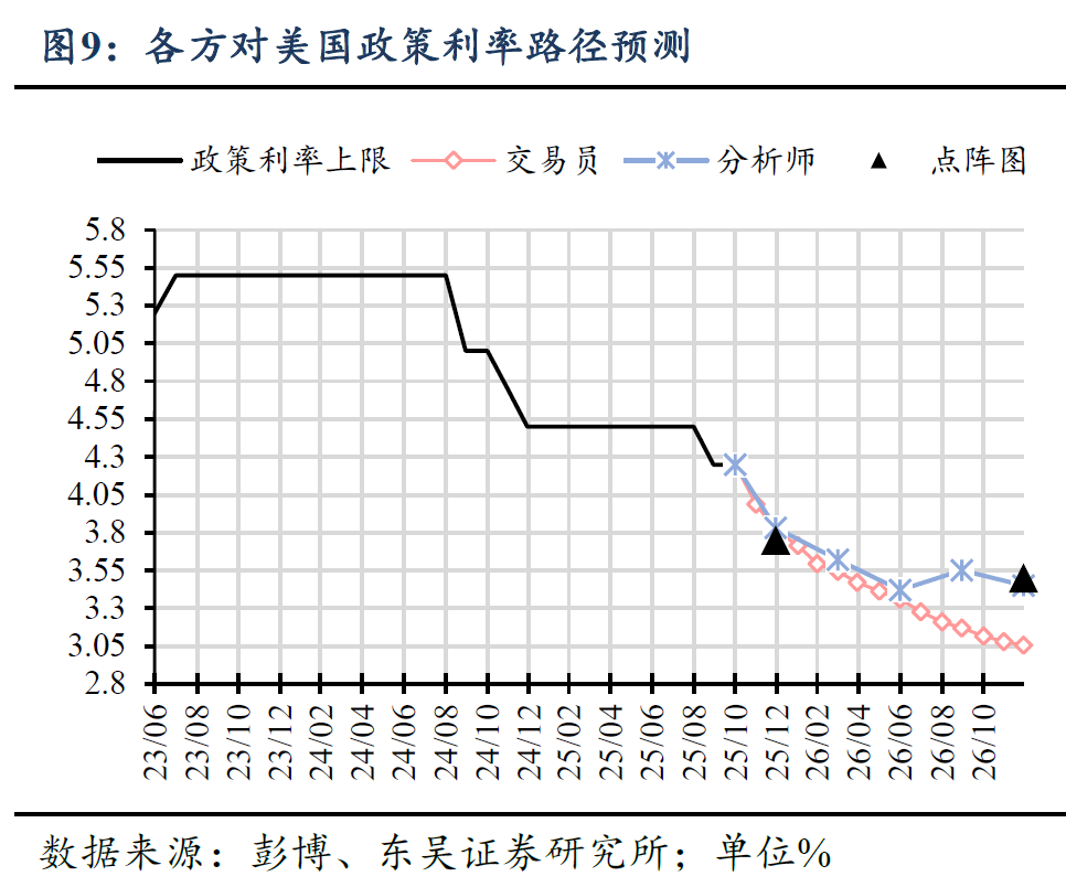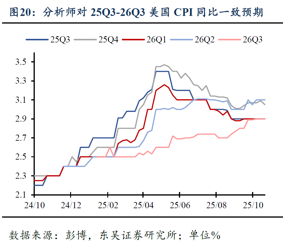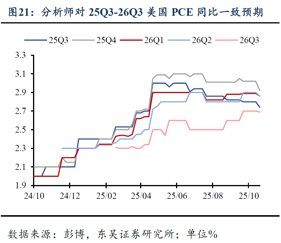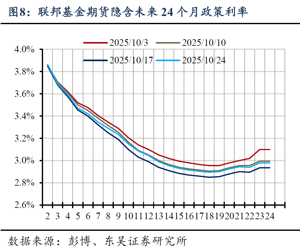 市场预期:分析师上调25Q3美国GDP预期,下修美国通胀预期。本周彭博更新了分析师对美国经济和货币政策的市场调查。根据彭博在10月17-22日对84名经济学家的问卷调查结果,增长方面,分析师显著上修25Q3美国增长预期,当前分析师一致预期25Q3-26Q4美国GDP季环比年率增速分别为2.8→1.1→1.5→1.9→2.0→2.0%,对25Q3预期相较上月大幅上修,对25Q4、26Q1的预期略有下修。通胀方面,分析师小幅下修2026年通胀预期,最新分析师一致预期25Q3-26Q4美国PCE同比增速分别为2.7→2.9→2.8→2.8→2.7→2.5%,其中对25Q3-26Q2的预测值均小幅下修0.1%。货币政策方面,最新分析师一致预期美联储将在10月29日、12月10日两次FOMC会议上各降息25bps,年底政策利率上限将下调50bps至3.75%;同时预测美联储将在明年3月、7月两次FOMC会议上各降息25bps,到2026年底政策利率上限将降至3.25%,这一预期相较当前市场联邦基金期货交易员预期的明年3次降息略为保守。