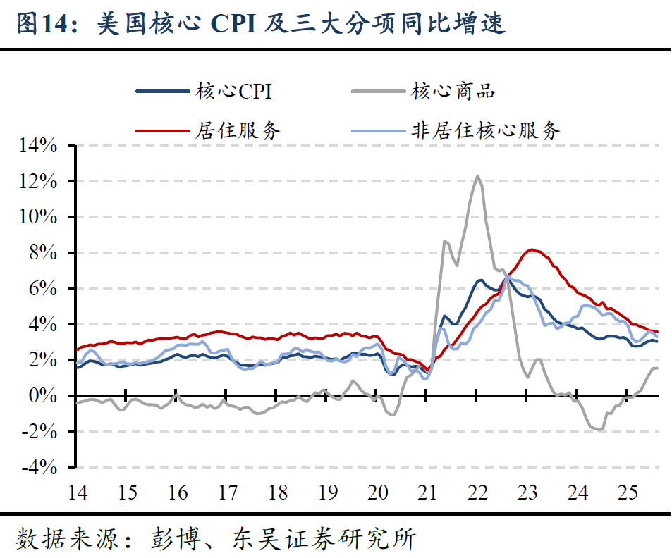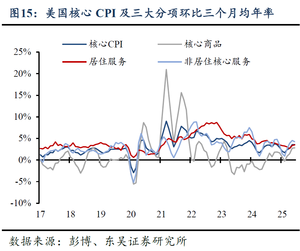 美国CPI:居住通胀的超预期回落带动9月美国核心CPI弱于预期,关税对核心商品通胀影响温和,超级核心通胀仍有黏性。本周五,BLS公布了延期的9月美国CPI数据。从总量数据看,美国9月CPI全面低于预期:CPI环比+0.3%,预期和前值+0.4%;核心CPI环比+0.2%,预期和前值+0.3%;CPI同比+3.0%,预期+3.1%,前值+2.9%;核心CPI同比+3.0%,预期和前值+3.1%。从数据结构看,本次居住通胀中的自住房折算(OER)分项环比增速由+0.38%回落至+0.13%,增速创下疫情以来新低,考虑到其高占比(26%),这一异常的回落是核心CPI不及预期的主要原因,但后续料不可持续。具体来看:①核心商品中,二手车价格环比由前值+1.04%降至-0.41%,是核心商品通胀降温的主要贡献;从领先指数Manheim二手车价格趋势来看,未来两个月CPI二手车料保持低位;与关税相关的家具、休闲商品价格环比再度提升,但幅度不及6-7月的连续环比大涨,一定程度上支持“关税对通胀的冲击是一次性的”论点。②居住通胀环比由前值+0.44%降至+0.21%,其中租金和自住房折算环比增速均显著回落,而自住房折算OER对CPI环比拉动率由+0.1%大幅回落至+0.035%,是本月总体和核心CPI环比不及预期的最大单一贡献。我们预期本月OER的异常大跌难以持续,后续料反弹至正常的0.2%-0.3%环比中枢,对应居住通胀同比增速仍有一小段回落空间。③除居住外核心通胀保持黏性,环比+,其分项则延续“此起彼伏”的结构,高波动的机票酒店回落,其余分项均有回升,显示服务业通胀的黏性犹存。向前看,四季度美国CPI季节性偏弱的特征明显,非季调口径下,11-12月美国CPI、核心CPI环比多为负数,因此未来2个月CPI、核心CPI料延续震荡回落路径。结构上,未来直至明年,核心CPI料延续核心商品向上、居住服务向下、非居住核心幅度震荡的局面,通胀同比料在3%附近维持黏性,但在非农就业持续恶化的宏观环境下,美国通胀数据的市场重要性正在下降。
