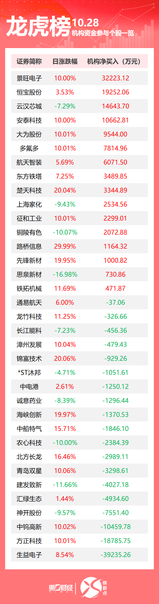 10月28日龙虎榜中,共35只个股出现了机构的身影,有16只股票呈现机构净买入,19只股票呈现机构净卖出。当天机构净买入前三的股票分别是景旺电子、恒宝股份、云汉芯城。当天机构净卖出前三的股票分别是生益电子、方正科技、中钨高新。