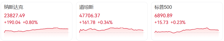 截至收盘,标普500指数上涨0.23%,收于6890.89点,盘中首次突破6900点关口;纳斯达克综合指数上涨0.80%,报23827.49点;道琼斯工业平均指数上涨161.78点,涨幅0.34%,收报47706.37点。