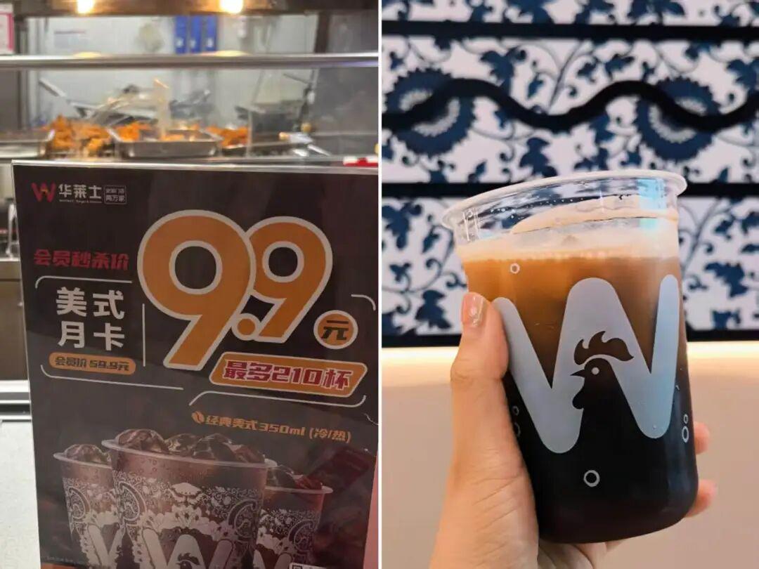 西式快餐里,麦肯旗下的平价咖啡品牌,麦咖啡以及肯悦咖啡加速快跑,华莱士上线9.9元咖啡月卡,特选IIAC国际金奖豆,一张月卡最多可兑换210杯,单杯甚至不到5分钱;