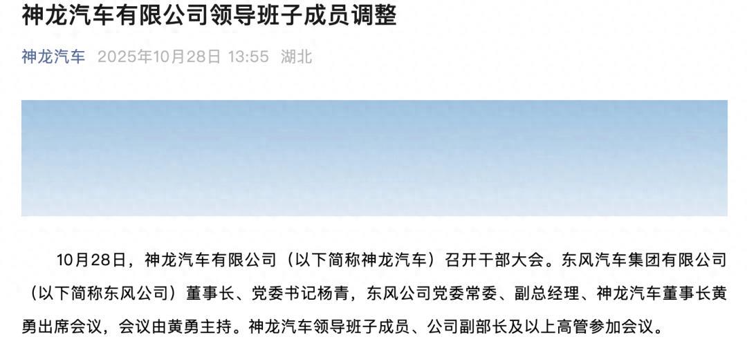 10月28日,神龙汽车有限公司(下称“神龙汽车”)召开干部大会,东风公司党委组织部部长郑红艺宣布神龙汽车领导班子成员调整的决定: