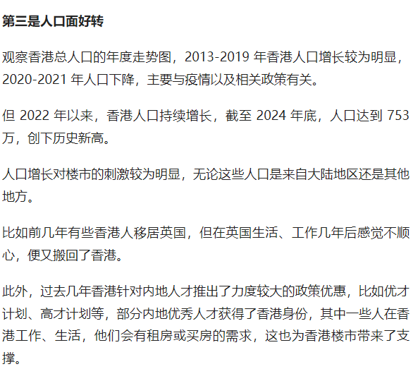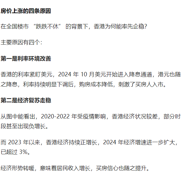 总而言之,利率降低、经济好转、人口增长、内地买房需求大增这四个因素,共同推动了过去几个月香港楼市见底反弹。