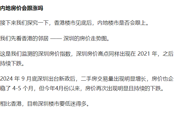 目前深圳楼市的走势和全国大势一致,受国内经济政策、人口等因素影响,其运行逻辑与香港楼市差别较大。