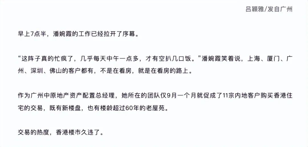 我们来看记者的报道,广州中原地产资产配置总经理表示,其团队在九月份促成了 11 宗内地客户购买香港住宅的交易,涉及新盘和二手房,这些客户来自上海、厦门、广州、深圳、佛山等地,这样的交易热度已许久未见。