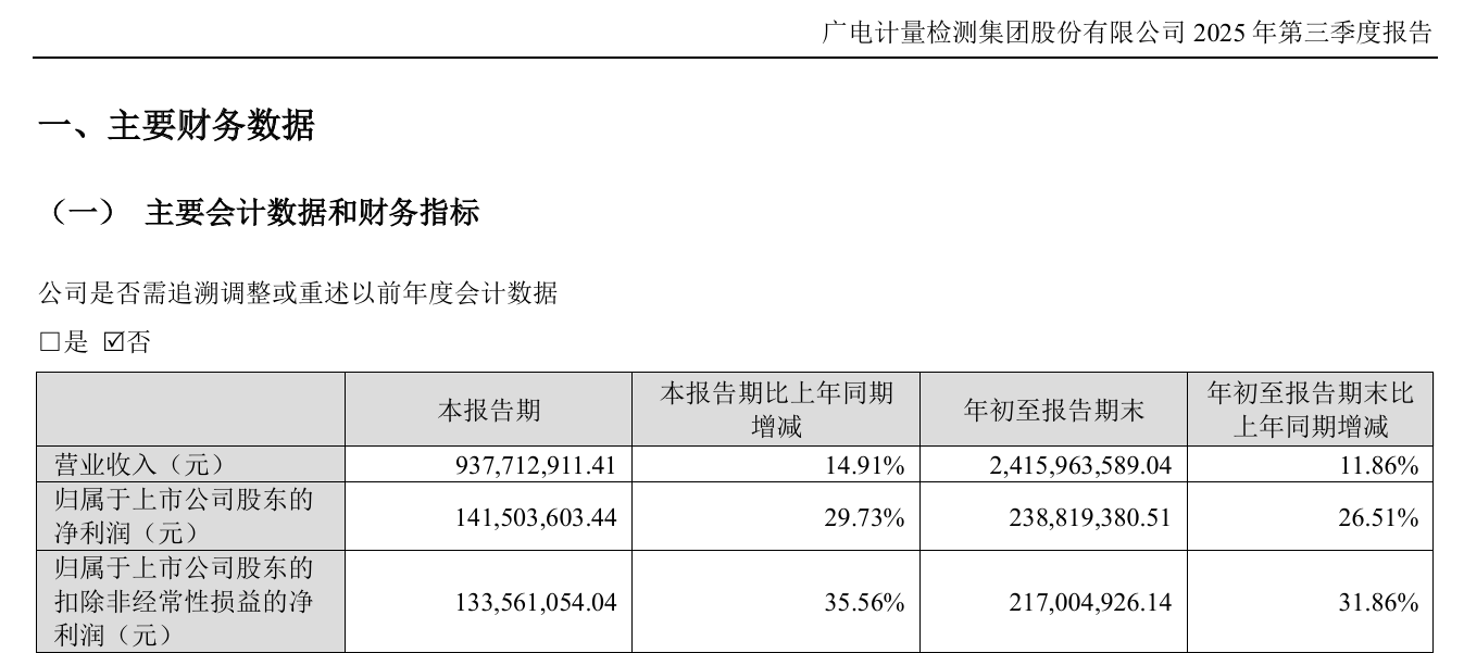 近日披露的三季度报告显示,广电计量2025前三季度营收、归母净利润均实现双位数增长。公司前三季度实现营业收入24.16亿,同比增长11.86%,第三季度实现营业收入9.37亿,同比增长14.91%;前三季度归母净利润2.38亿,同比增长26.51%,第三季度实现归母净利润1.41亿,同比增长29.73%。