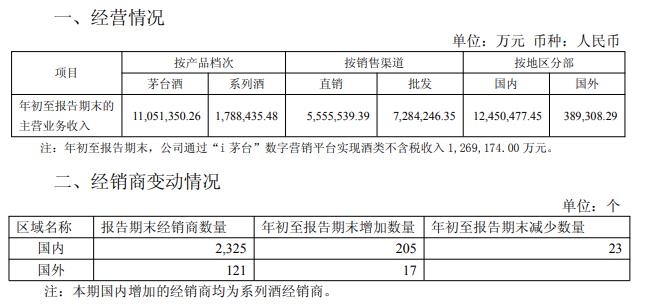 分产品看,2025年前三季度,贵州茅台的茅台酒营业收入1105.14亿元,系列酒营业收入178.84亿元;直销渠道收入555.55亿元,批发渠道收入728.42亿元。公司通过“i 茅台”数字营销平台实现酒类不含税收入126.92亿元。
