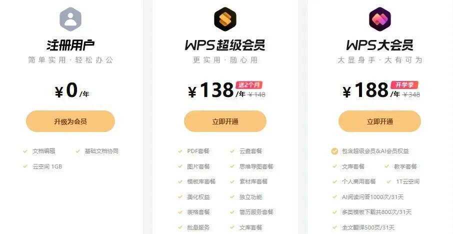 WPS会员包含两类,超级会员和大会员,促销价分别为138元/年、188元/年。超级会员多为基础功能的升级套餐,WPS大会员则包含最新的17项AI权益。
