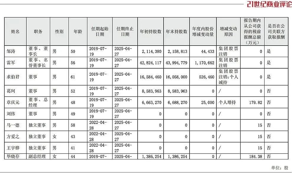 董事会下设四个专门委员会,各5名成员,雷军的名字,仅出现在战略委员会一栏,存在感低。他持有金山软件8.21%的股份,按市价算,价值超125亿元。