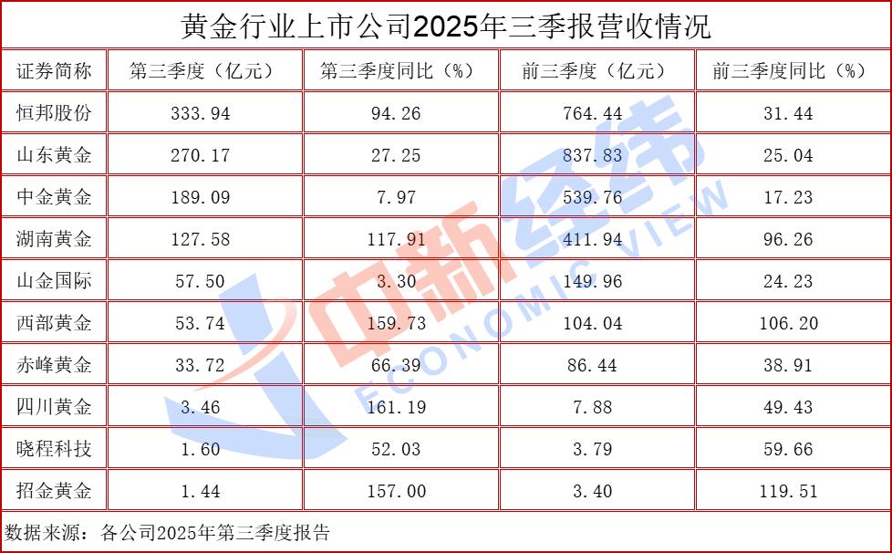 数据显示,10家黄金上市公司2025年第三季度、前三季度营业收入齐涨。