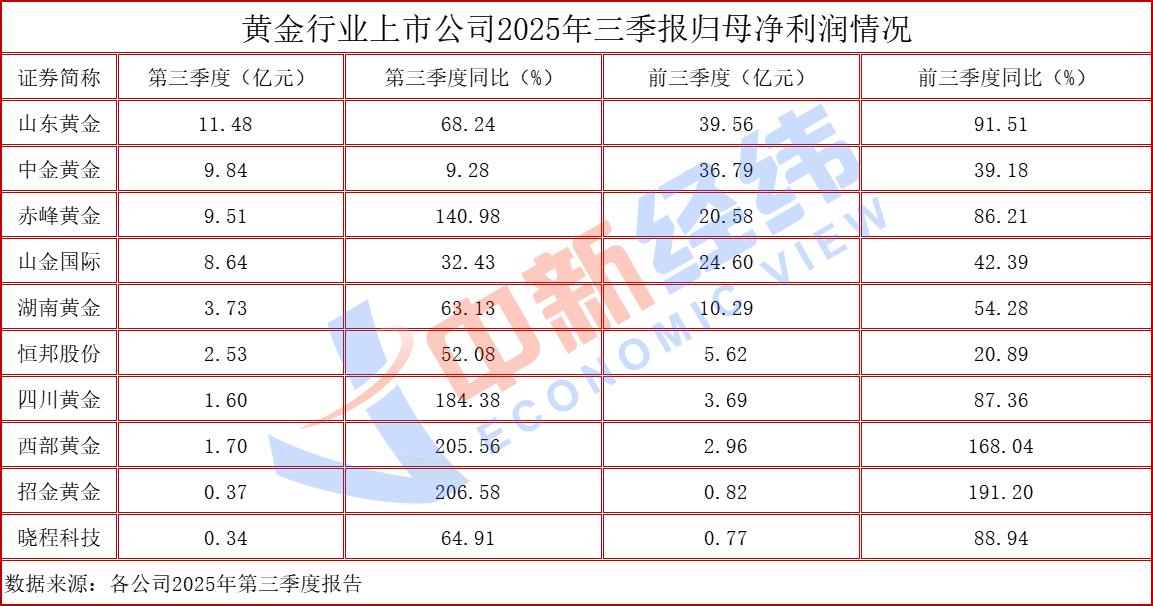 数据显示,10家黄金上市公司2025年第三季度、前三季度归母净利润齐增。