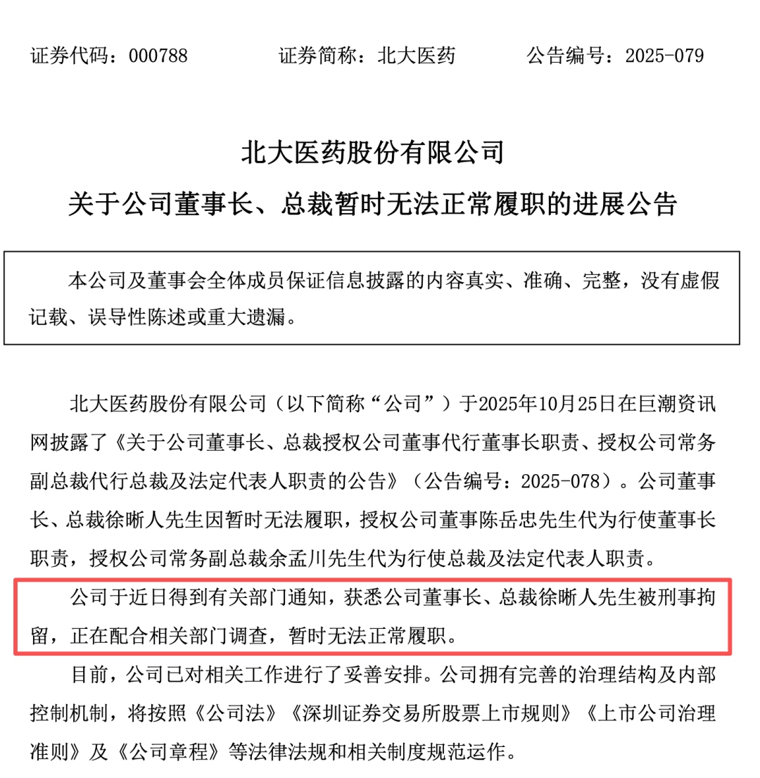 时隔不到一周,徐晰人无法履职的原因初步揭晓。对其被刑拘的具体原因,北大医药并未给出进一步说明,“截至本公告披露日,公司尚未知悉相关调查的进展及结论。”