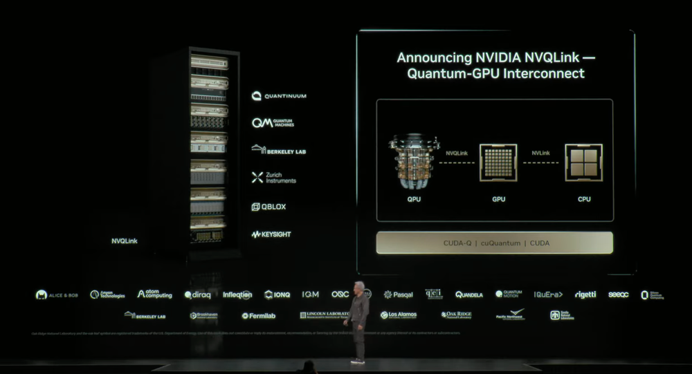 在量子计算领域,英伟达推出全新互联架构NVQLink 与计算平台 CUDAQ,实现量子处理单元(QPU)与GPU超级计算机的协同。通过AI驱动的量子纠错与混合模拟,英伟达计划与美国能源部(DOE)合作建设七台新一代AI超级计算机,以推动基础科学研究。包括伯克利、费米实验室、洛斯阿拉莫斯等八大国家实验室已加入该计划。