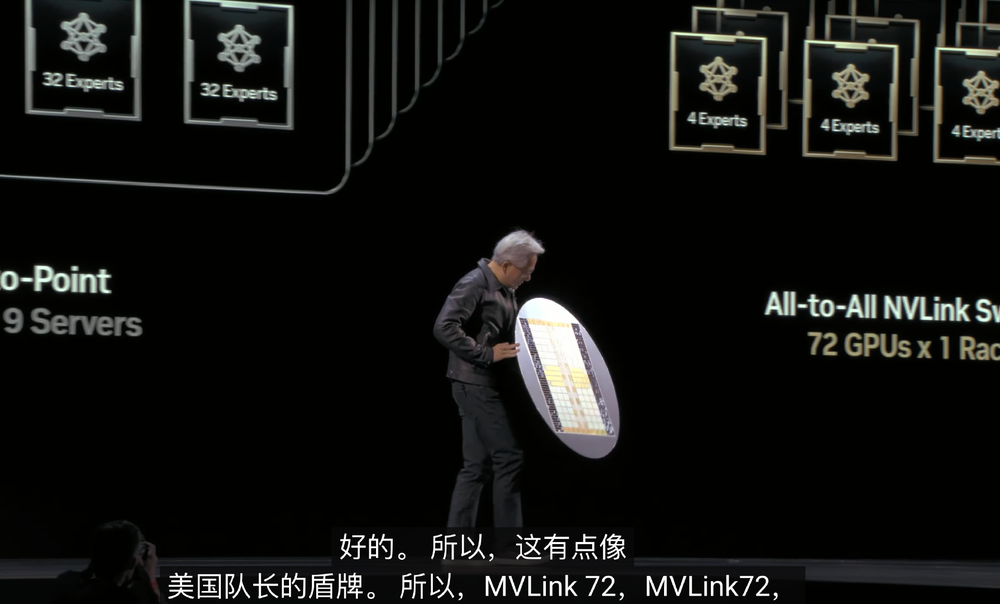 我马上让你见识它的妙处。但本质上我们所做的,好吧,这有点像美国队长的盾牌。所以NVLink72,如果我们要制造一枚巨型芯片,一块巨型 GPU,它看起来会是这样。这就是我们必须进行的晶圆级加工的程度,太不可思议了。