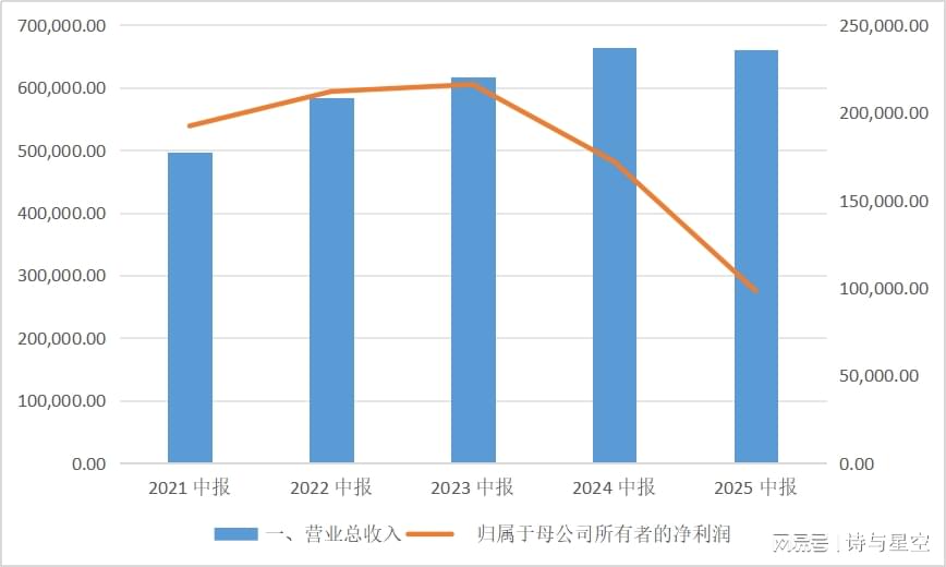 2025年上半年业绩进一步恶化,营收66.03亿元微降0.54%,净利润9.83亿元同比大降42.85%,净利率从2023年的32.79%骤降至2025年上半年的14.11%,近乎腰斩。