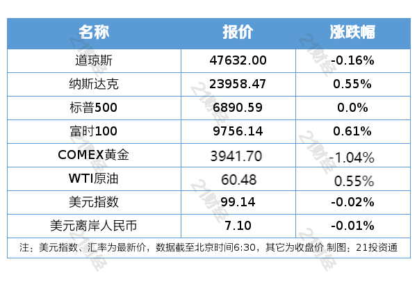 纽约股市三大股指10月29日涨跌不一。截至当天收盘,道琼斯工业平均指数比前一交易日下跌74.37点,收于47632.00点,跌幅为0.16%;标准普尔500种股票指数下跌0.30点,收于6890.59点;纳斯达克综合指数上涨130.98点,收于23958.47点,涨幅为0.55%。英伟达涨约3%,总市值突破5万亿美元大关;苹果小幅收涨,首次收盘时总市值超4万亿美元。