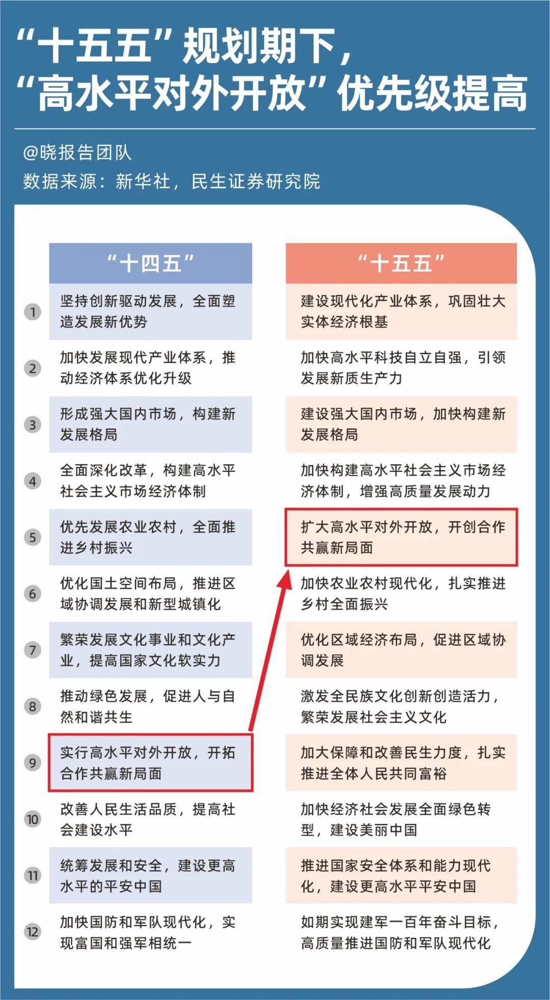 值得注意的是,在“十五五”规划建议中,对比“十四五”时期,“高水平对外开放”的优先级显著提升,定调也从基础的“实行”转向更进取的“扩大”。这意味着企业出海和中国“再全球化”将迎来红利。