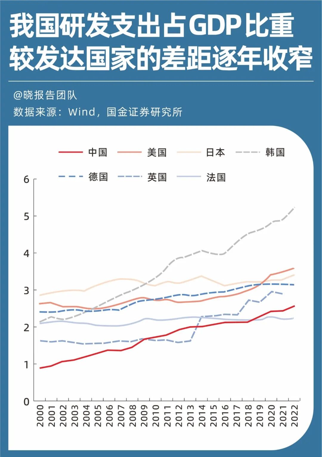 “十四五”时期,我国科技创新实力显著提升,2024年研发经费投入3.6万亿人民币,稳居世界第二;专利申请与授权量全球第一;研发总支出占GDP比重达到2.4%,已经高于法国水平。