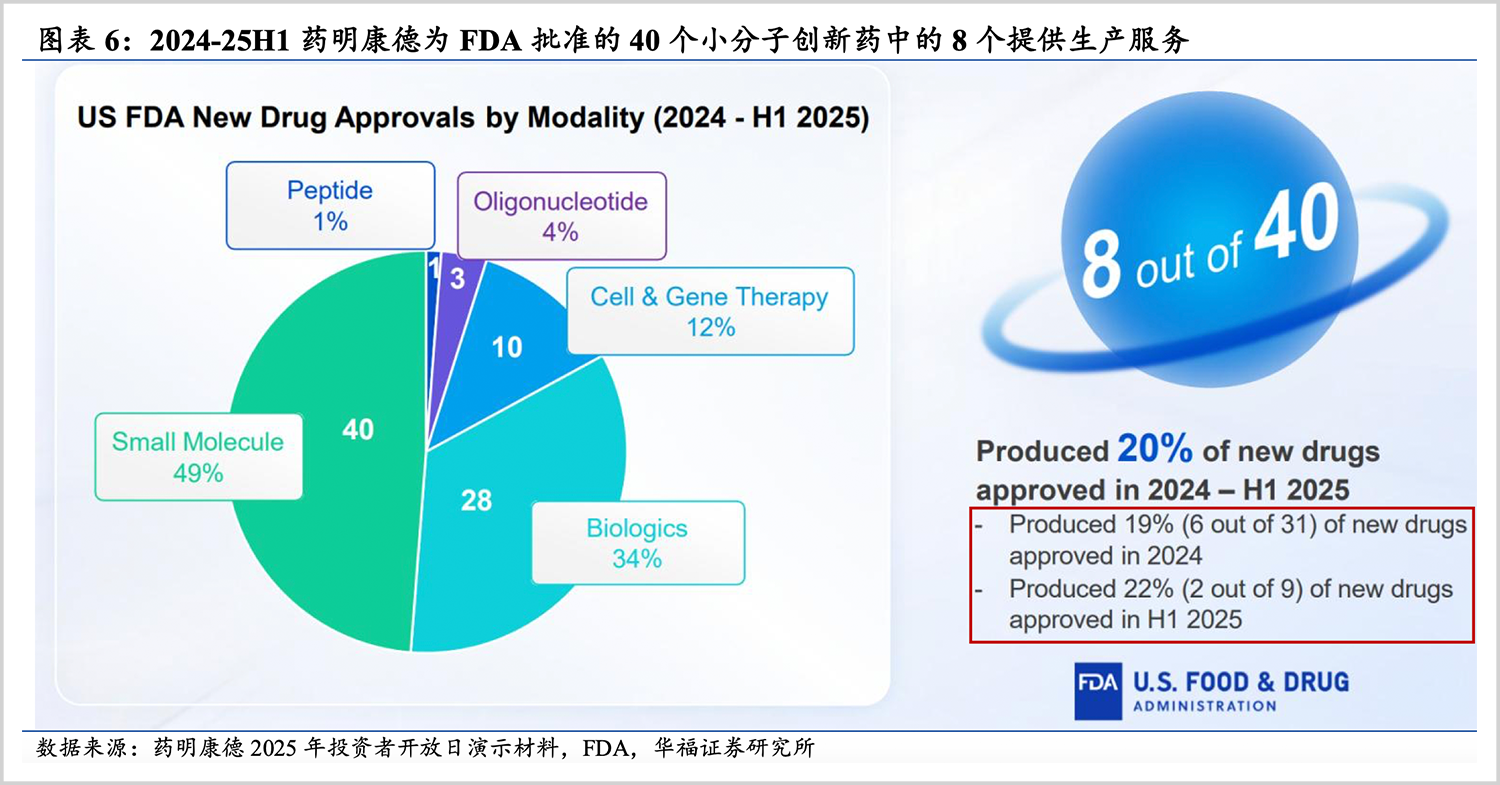 从2024年到今年上半年,FDA批准上市的40个小分子创新药中,药明康德化学业务平台为其中8个提供服务,占比20%。