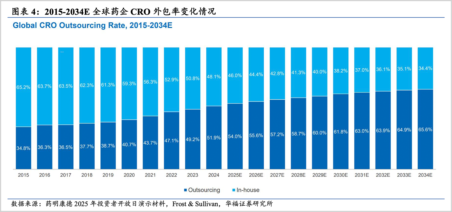 与此同时,产业规模还在快速提升。全球医药研发投入在2015年为1549亿美元,十年后突破2954亿美元,预测2034年攀升至4761亿美元;CRO外包率从2015的34.8%上涨到2024年的51.9%,渗透率已超一半,且有望在2029年达到60%。