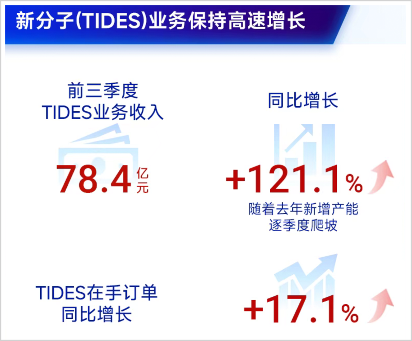 TIDES业务(寡核苷酸和多肽)保持高速增长,前三季度及第三季度收入亦创下历史新高。9月,公司泰兴多肽产能建设提前完工,多肽固相合成反应釜总体积超过10WL。产能规模将保证业绩可持续性。