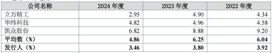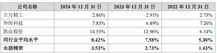 报告期各期,永励精密研发费用分别为1,628.68万元、1,933.31万元和1,966.30万元,占当期营业收入的比重分别为3.92%、3.80%和3.46%,低于同行业可比公司的平均水平6.04%、6.25%和4.86%。