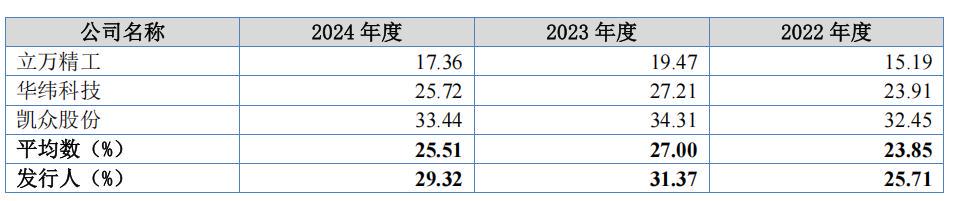 报告期内,公司的综合毛利率分别为25.71%、31.37%和29.32%,高于同行业可比公司均值,2024年毛利率下降2.05个百分点。与可比同行均值相似,都是起伏走高。
