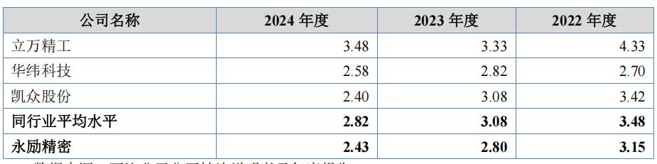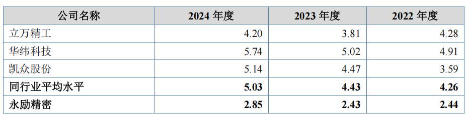 报告期内,永励精密存货周转率分别为2.44、2.43和2.85,低于同行业平均水平4.26、4.43和5.03,主要由于公司对原材料及半成品储备量较高,同时由于发出商品规模相对较高,致使公司存货周转率低于同行业平均水平。