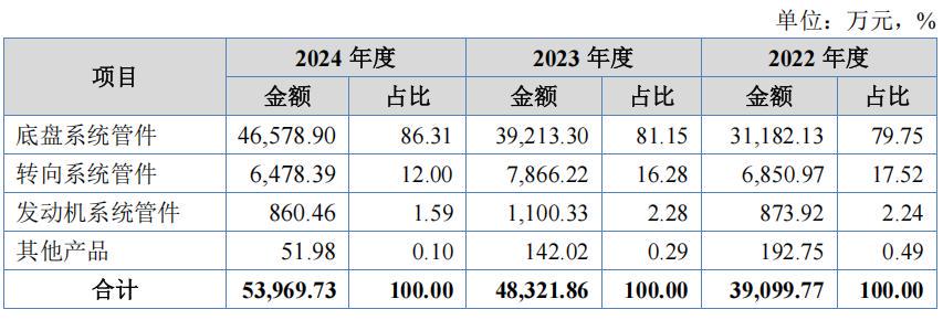 报告期内永励精密的产品主要分为底盘系统管件、转向系统管件和发动机系统管件三个类别。其中,底盘系统管件收入占比较高,报告期内占主营业务收入的比重分别为79.75%、81.15%和86.31%。