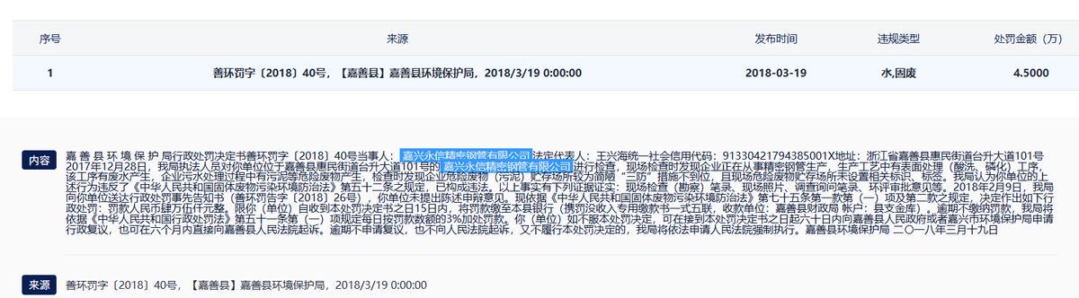 据善环罚字(2018)40号文件显示,2018年3月19日,嘉善县环境保护局因嘉兴永信精密水、固废排放异常,处罚公司4.5万元。