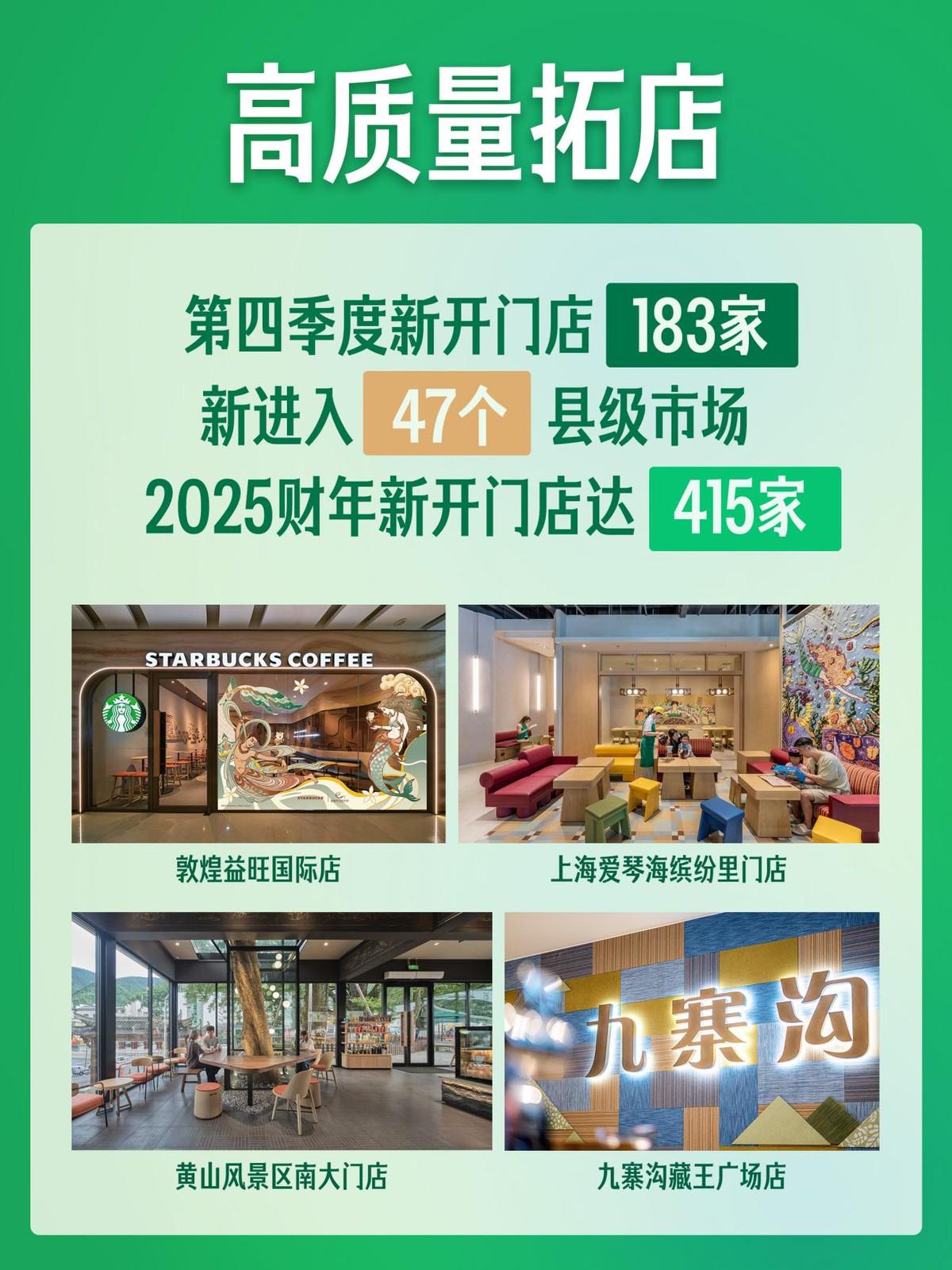 高质量开店:第四季度新开出183家门店,新进入47个县级市场。2025财年全年累计净新增门店达415家。包括杭州非遗概念店、黄山景区店、上海爱琴海缤纷里门店(位于乐高乐园配套商业街区)等在内的特色门店的开业,持续强化星巴克的第三空间布局以及与在地文化的深入联结。截至2025财年末,星巴克在全国1091个县级城市开出了8011家门店。新店保持了高效的盈利水平,两年内的新开门店持续贡献高于均值的同店销售。新开店强劲的经济效益,为星巴克持续把握中国市场的广阔发展机遇奠定了坚实基础。