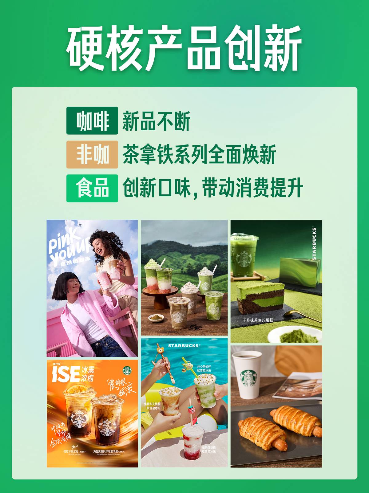 咖啡-推出新品香水粉椰拿铁、金桂系列等时令新品。其中,香水粉椰拿铁选用珍稀泰国香水椰,搭配星巴克金烘浓缩咖啡,支持客制化定制糯香斑斓、莓莓等风味。值得关注的是,星巴克是市场上唯一提供无糖桂花风味美式与拿铁的品牌,树立了健康风味饮品新标杆,并丰富了“真味无糖”产品选择。非咖-王牌品类茶拿铁系列迎来焕新升级,抹茶拿铁以更好的原料、工艺和配方标准重塑经典,将备受好评的焙茶拿铁引入中国市场,为顾客提供更健康的风味和细腻口感,精准响应新消费趋势和需求。茶拿铁系列进一步丰富了非咖产品组合,并大大提升了下午茶时段销售。食品-融合西式风格,创新推出多款符合中国人口味的新品,包括爆汁脆肠酥皮卷、早餐三明治系列、慢炖番茄牛肉芝士薄饼、香烤白汁大虾芝士薄饼等,带动早餐和午餐时段消费提升。
