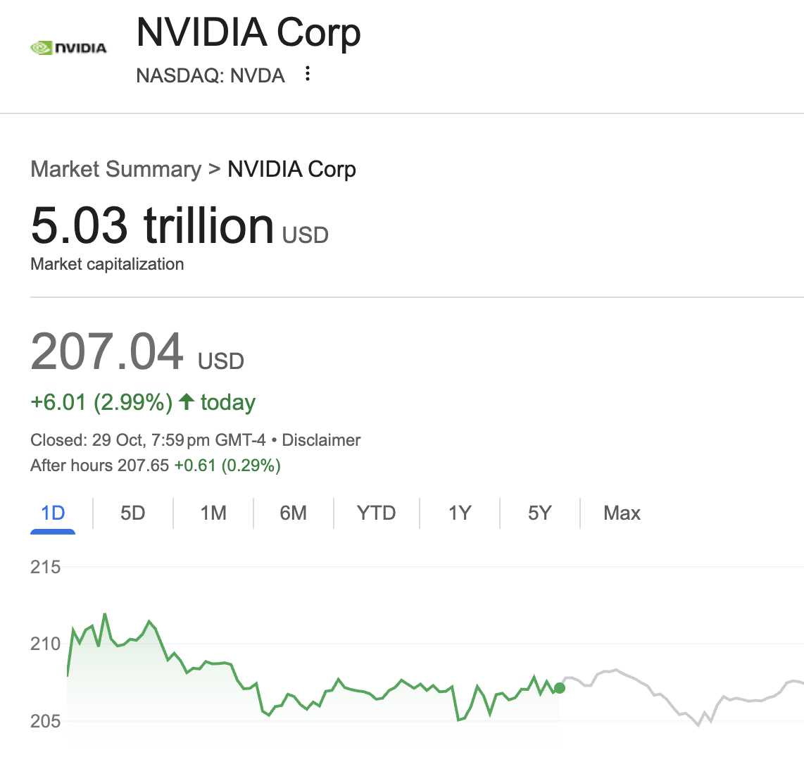 10月29日美股收盘,英伟达股价上涨2.99%至207美元/股,总市值高达5.03万亿美元;三个月前的7月9日,英伟达市值刚刚超4万亿美元,现在它的体量已经超过2024年德国、日本的GDP。