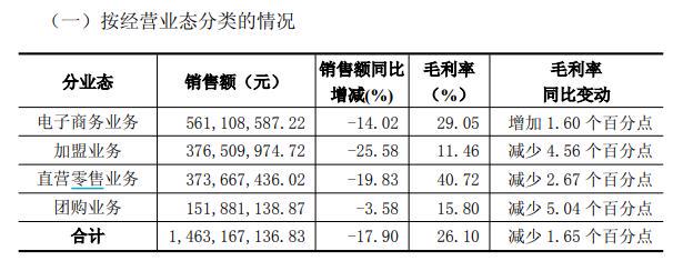 分经营业态看,四个业务销售额同比均下滑,仅电子商务业务毛利率同比增加1.60个百分点。