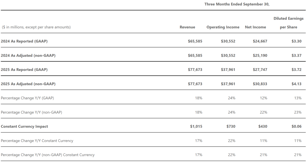 当地时间10月29日,微软公布截至2025年9月30日的2026财年第一财季业绩,第一财季营收776.73亿美元,高于市场预期的753亿美元,同比增长18%;净利润同比增长12%至277.47亿美元;摊薄后每股收益3.72美元,高于市场预期的3.67美元。