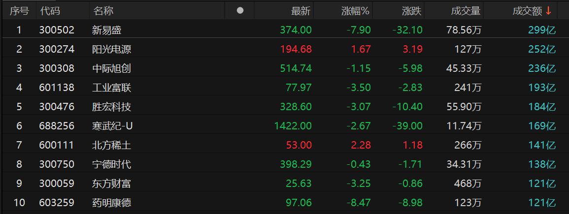 新易盛成交额居首,为299亿元。其后是阳光电源、中际旭创、工业富联、胜宏科技,成交额分别为252亿元、236亿元、193亿元、184亿元。
