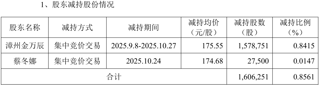 与此同时,公司副总经理、财务总监兼董事会秘书蔡冬娜减持计划也已完成。蔡冬娜通过集中竞价方式减持公司2.75万股,变动比例为0.1456%,按成交均价174.68元/股计算,减持金额为480.37万元。