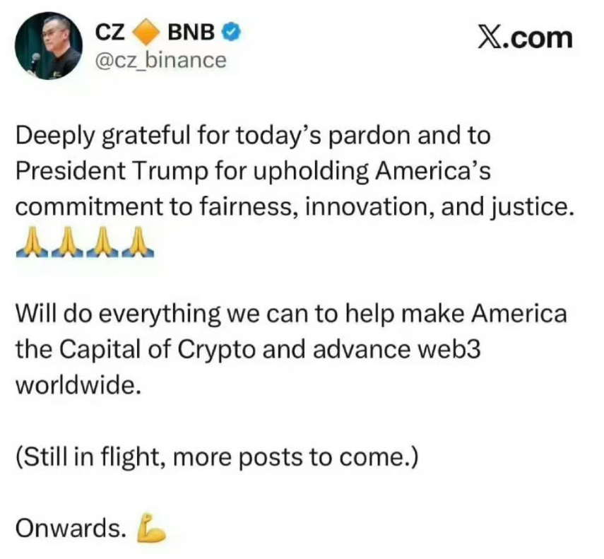 获得特赦后,赵长鹏迅速发声感谢特朗普,并承诺“将全力帮助美国成为加密货币之都”。这番表态的落脚点意味深长——无论个人如何翻盘,最大的赢家终将是美国。