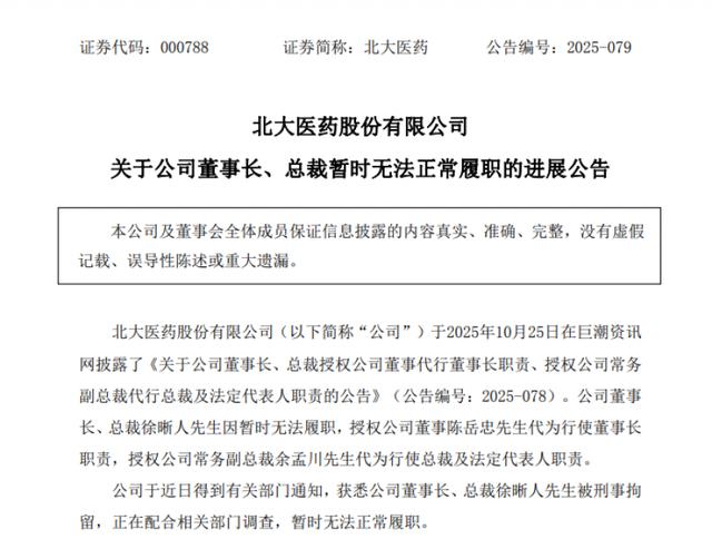 10月29日晚间,北大医药(000788.SZ)公告称,公司实际控制人(董事长、总裁)徐晰人因配合相关部门调查被刑事拘留,暂时无法正常履职。