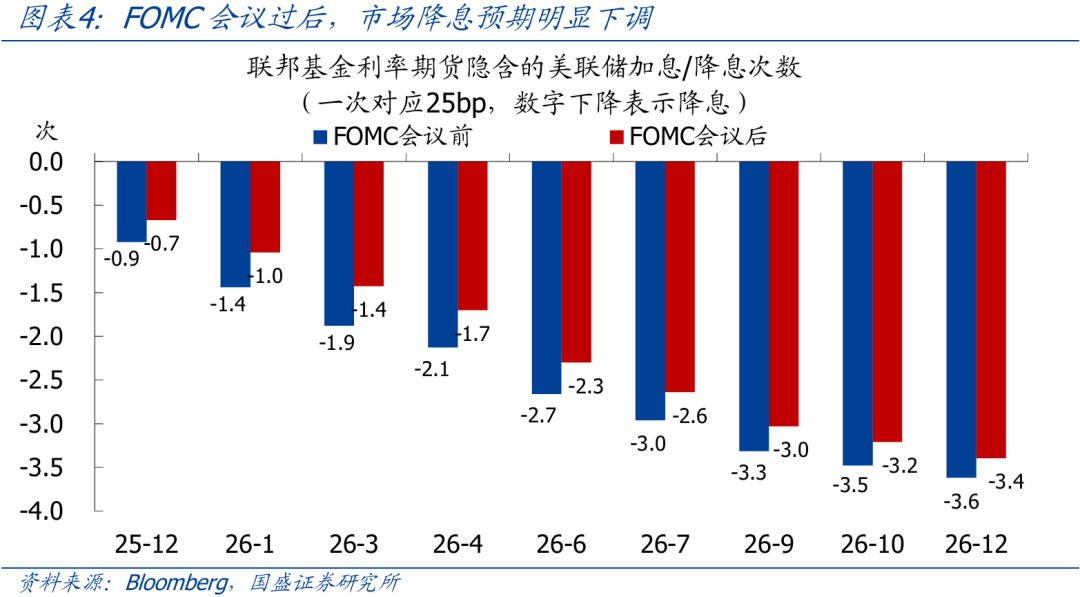 >降息预期变化:会议过后,市场对美联储降息的预期明显下调。利率期货隐含的12月降息概率从超过90%降至不足70%,2026年底前剩余降息次数从3.6次降至3.4次。