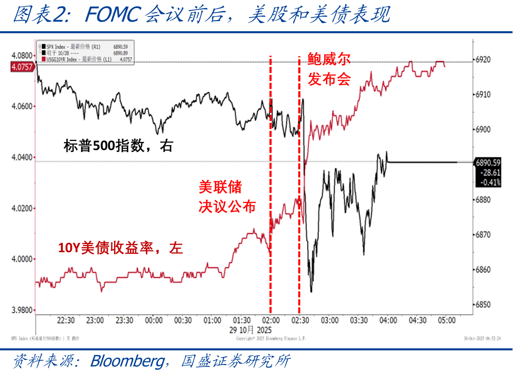 >会议决议:美联储下调联邦基金利率25bp至3.75-4.0%,符合市场预期,并宣布将于12月1日结束缩表,此后抵押贷款支持证券的赎回本金将被再投资于短期国债。会议声明与9月相比,对经济的表述由“增长放缓”改为“温和扩张”,部分细节修改为“现有指标”、“截至8月”等措辞,主因政府停摆导致了部分数据延迟发布。值得关注的是,本次会议有2人投下反对票,其中,米兰主张降息50bp,施密德主张不降息,这反映出美联储内部分歧进一步加剧。