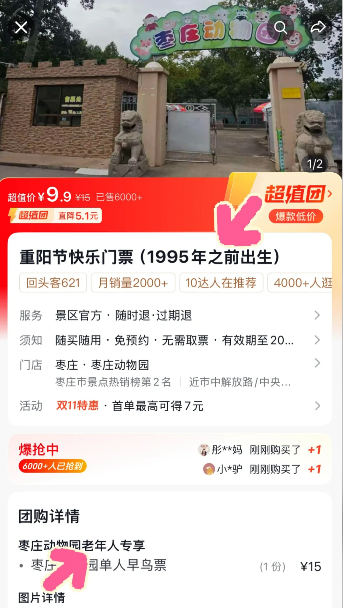 近日,有网友在社交媒体平台发帖称,自己团购的枣庄动物园的“重阳节快乐门票”,专门标注了“1995年之前出生”的使用条件,并且团购详情描述此门票为“老年人专享”。