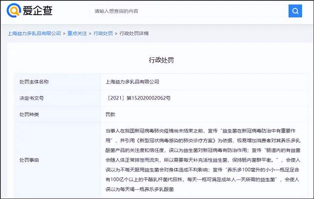 当年3月,上海益力多在公众号宣称“益生菌对新冠防治有重要作用”,被上海市浦东新区市场监管局罚款45万元,理由是涉嫌虚假宣传。